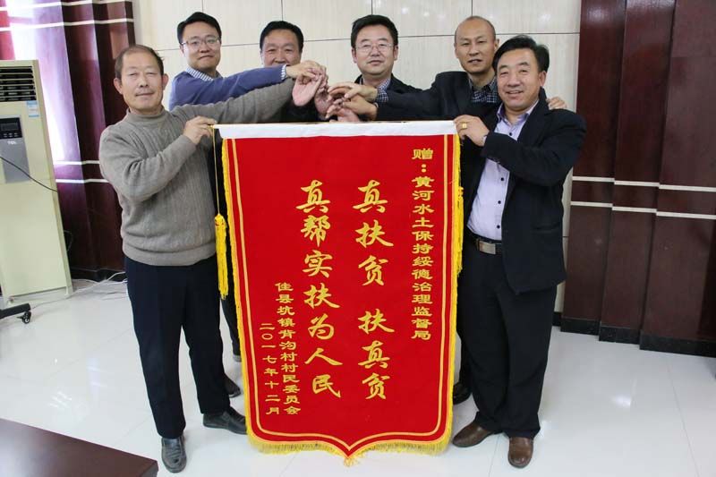会上,高文强书记详细的介绍了在黄河上中游管理局的帮扶下,背沟村这个贫困村里发生了翻天覆地的变化。黄河上中游局局长王健带领我局负责人亲自到背沟村了解情况后,累计帮助背沟村筹措项目总资金400多万,并对背沟村进行几次产业帮扶,修建了大型公共水池,对全村铺设道路,装修了村卫生室,解决了全村水、电、路、卫生等问题,整个村子面貌焕然一新,村里的贫困户收入和生活水平明显提高。高文强满含激动的赞扬了我局扶贫干部王永辉同志和王刚同志。村里都说,黄委的扶贫工作队,扶贫扶出真情。扶贫队员在村里吃住的差,自家也困难,但是他们依然不怕苦不怕累,舍小家顾大家,坚守在扶贫第一线,了解村里困难情况,并积极向黄河上中游管理局反映,寻求帮助。我局王永辉同志是个热心肠,在村里很有口碑,扶贫这段时间,多次主动出面调解村民之间的矛盾,并成功劝服多次突发性群体事件;王刚同志利用自身所学,帮村里义务拉电。村里人都晓得,黄委扶贫队员能吃苦,责任心强,全心全意为大家谋福利,是靠的住的干部。为感谢黄河上中游管理局和我局对背沟村的帮助,书记高文强、村长高虎军特地代表全村向我局赠送一面锦旗来表达谢意。